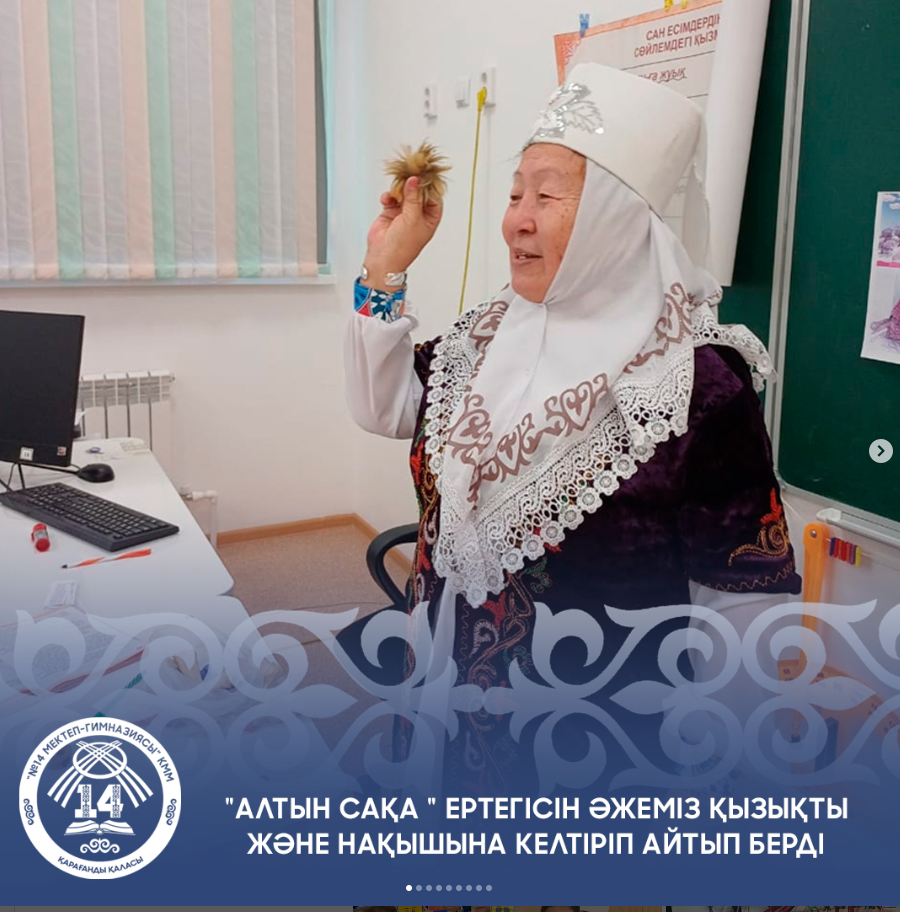 Тұлға бойындағы рухани құндылықтарды қалыптастыру мақсатында әдебиеттік оқу пәнінен "Алтын сақа " ертегісін Алдаберген Әмина оқушымыздың әжесі Умбетова Аманай қызықты және нақышына келтіріп айтып берді. Сонымен қатар оқушылар асық түрлерімен және жылқы малының жасына қарай атауларымен танысты. 4"Ә " сыныбы.