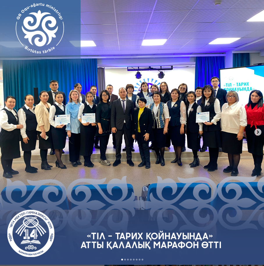 2023 жылдың 26 желтоқсанында №14 мектеп-гимназиясында «Қарағанды қаласы білім бөлімі» ММ әдіскері Қадыр Айгүл Еркінқызының қолдауымен, қазақ тілі мен әдебиеті және тарих пәндері бірлестігінің ұйымдастыруымен қазақ тілі мен әдебиеті және тарих пәндерінде көркем шығармаларды оқытуда дидактикалық материалдарды іс-тәжірибе алмасу барысында қолдану; ұжымда бірлесіп жұмыс атқаруда контент жинақтары бойынша рухани құндылыққа негізделген озық тәжірибелермен бөлісу мақсатында «Тіл – тарих қойнауында» атты қалалық марафон өтті.