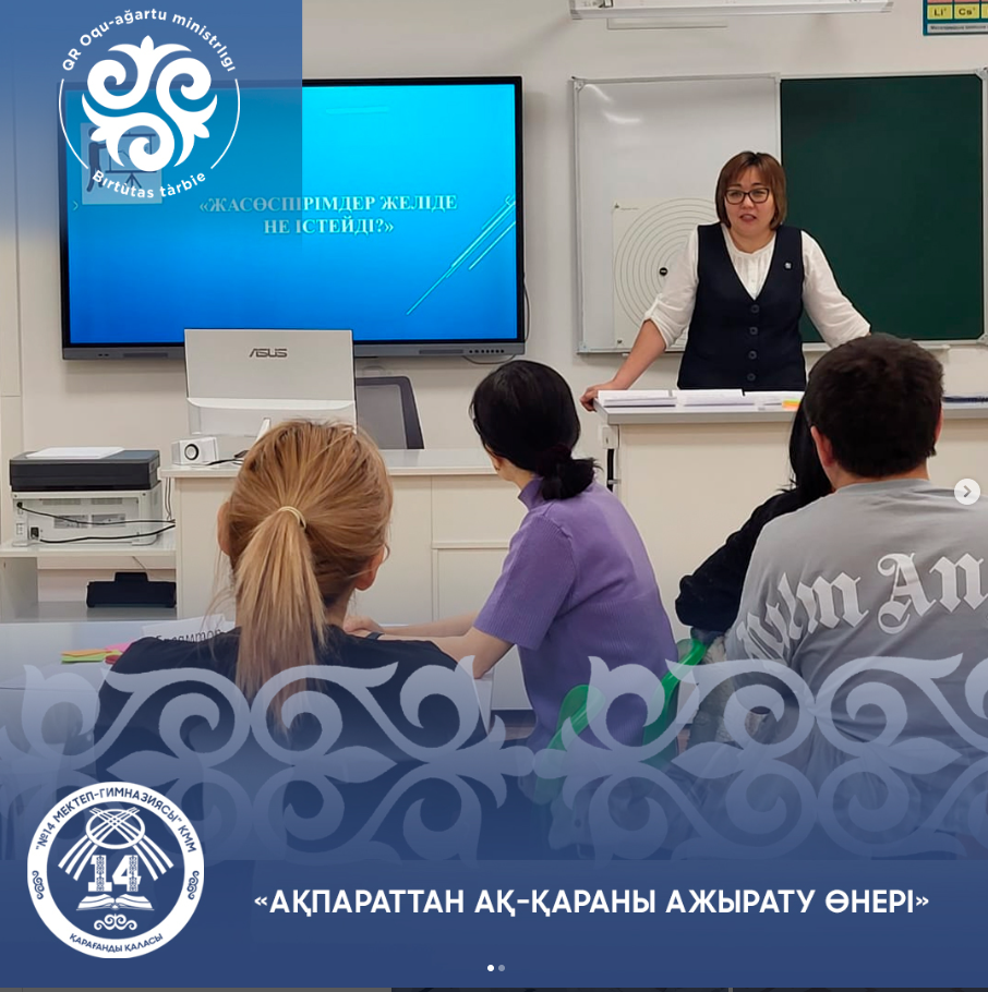 Ата-аналарды педагогикалық қолдау аясында 8-сынып сынып жетекшілерінің ұйымдастыруымен «Ақпараттан ақ-қараны ажырату өнері» сабағы өтті. Онда ата-аналарға интернетке тәуелділіктің, кибербуллингтің алдын алу , интернет ресурстарын қауіпсіз пайдалану, және жалпы медиакеңістіктен қалай қорғануға болатыны туралы ақпараттар берілді.