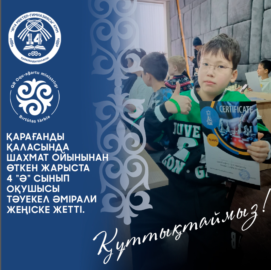 Қарағанды қаласында шахмат ойынынан өткен жарыста 4 "Ә" сынып оқушысы Тәуекел Әмірали жеңіске жетті.