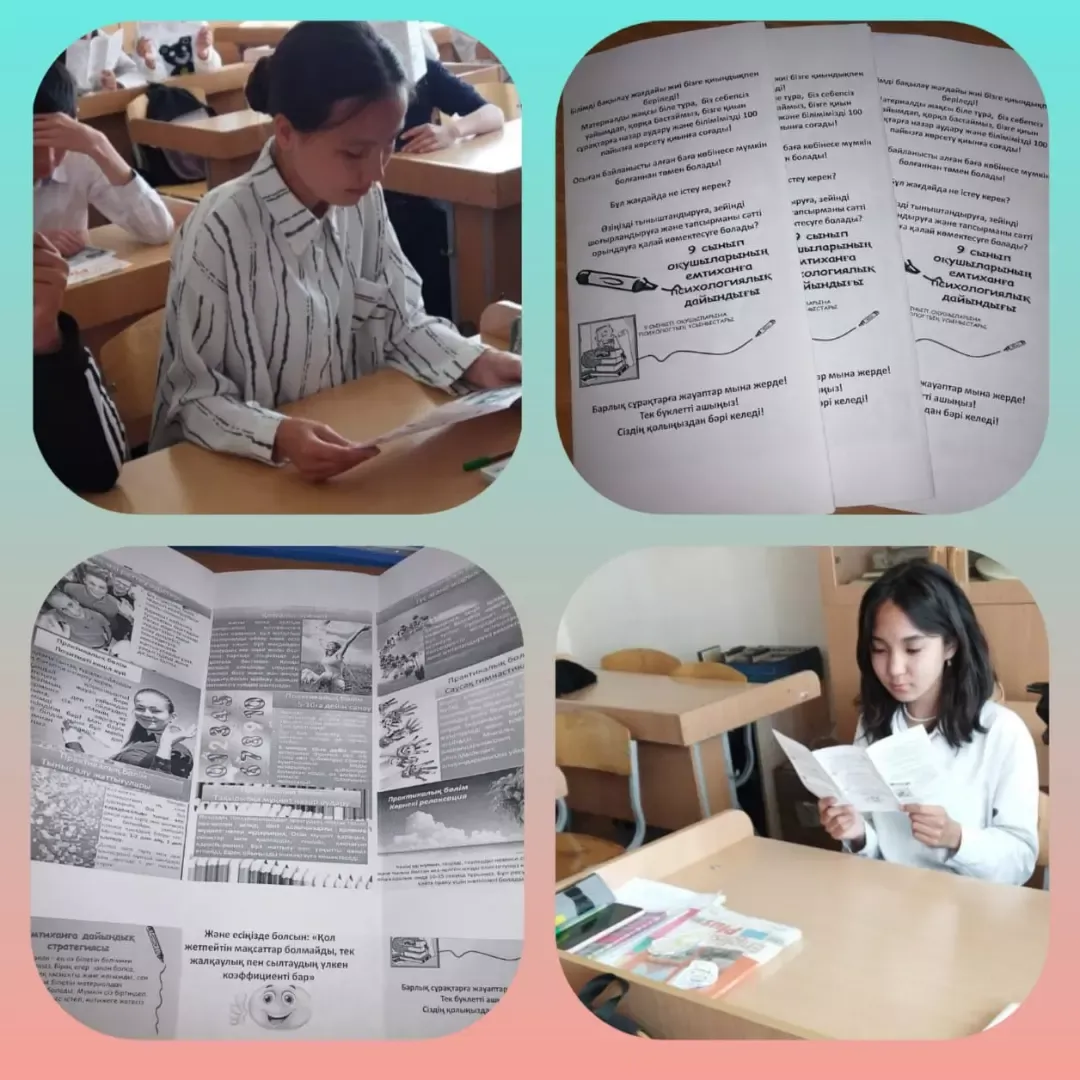 16 мамыр күні 9 сынып оқушыларының мемлекеттік емтиханға дайындығы кезінде оқушыларды психологиялық қолдау негізінде психологтың кеңес беру жұмысы өткізілді. Оқушыларға арнайы жадынама әзірленіп, таратылды. Аталмыш жадынаманың теориялық бөлімінде: емтиханға дайындық кезеңдері, дайындық стратегиялары, ал практикалық бөлімінде: оқушылардың бойындағы қобалжу деңгейін төмендетуге арналған жаттығулар ұсынылды. Жауапты: мектеп психологы Елубаева А.Ш.