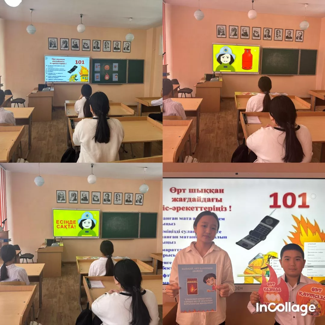 Мақсаты: Өрт қауіпсіздігі бойынша оқушыларға өрттің алдын алу, оның салдарын азайту және өрт шыққан жағдайда дұрыс әрекет ету дағдыларын меңгерту. Сынып сағатында оқушыларға өрттің себептері, қауіпті жағдайлар, өрт шыққан жағдайда не істеу керектігі, эвакуация жолдары жөнінде ақпарат берілді.