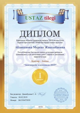 Қарағанды облысы Қарағанды қаласы «№36 жалпы білім беретін орта мектебі» КММ бастауыш сынып мұғалімі Абдикенова Мереке Жаксыбаевна  «Зияткерлік олимпиада - 2019» Республикалық Бастауыш сынып ұстаздары арасында олимпиадаға үздік қатысқаны үшін I дәрежелі дипломмен марапатталады.