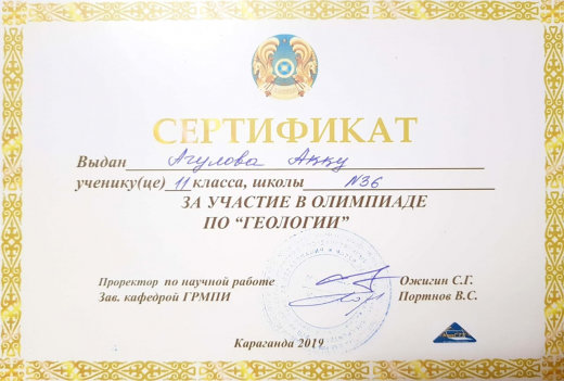 Қарағанды мемлекеттік техникалық университетінің тау-кен факультетінде Геология пәні бойынша оқушылар арасында өткен олимпиадада №36 ЖББОМ 11 "Ә" сынып оқушысы Агулова Аққу 3 орынға ие болды.