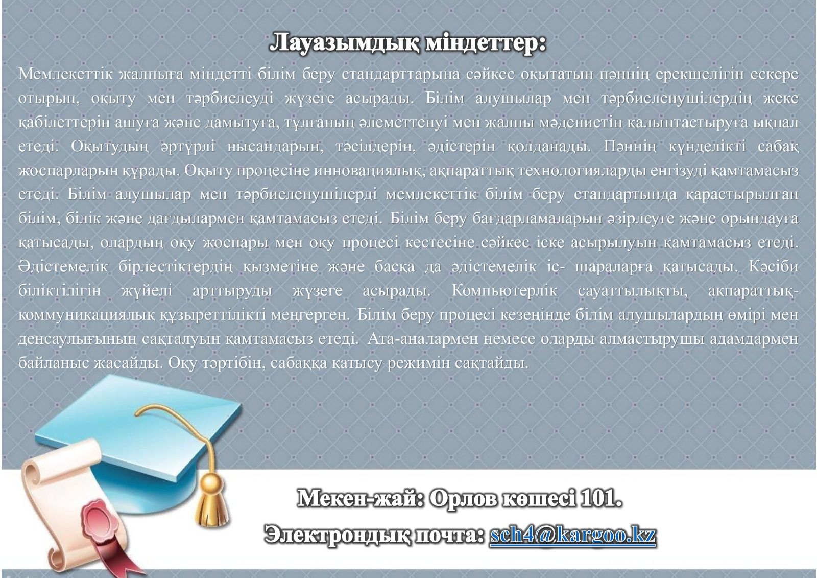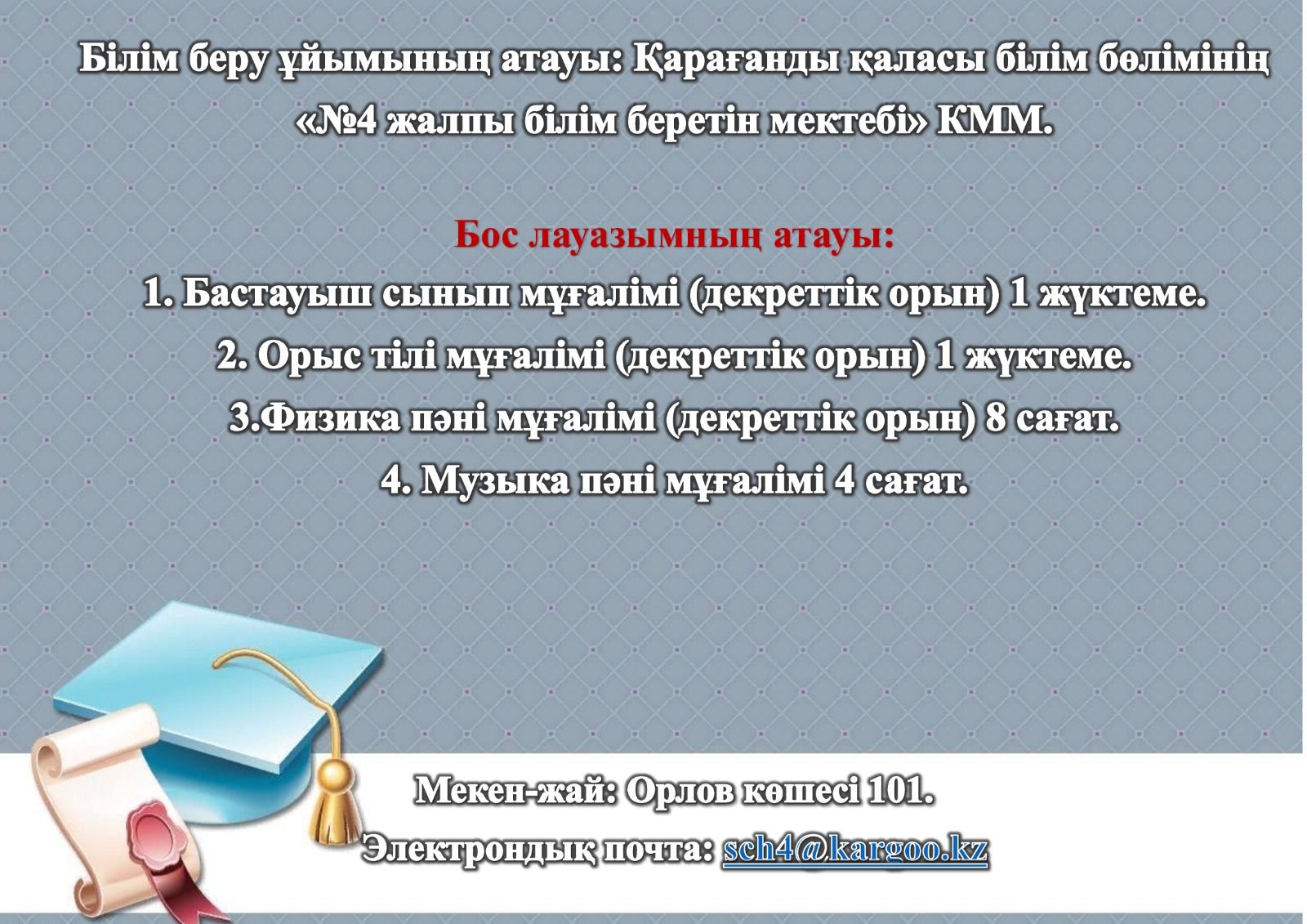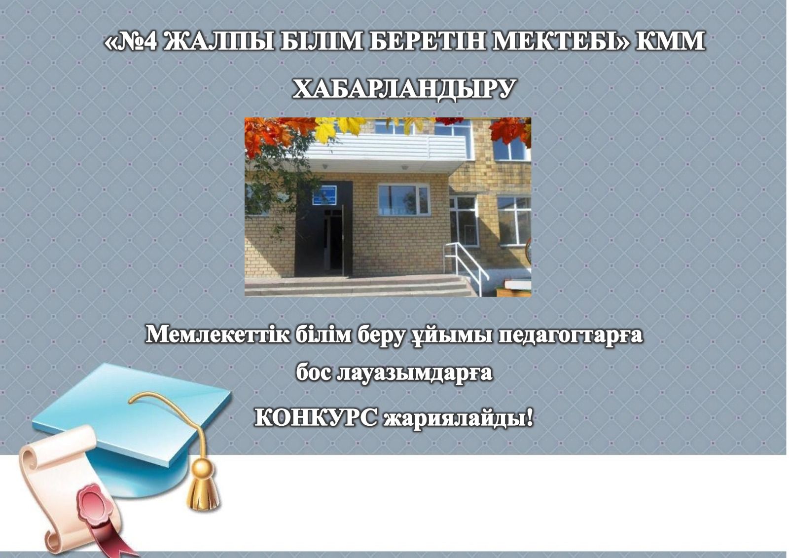 №4 Жалпы білім беретін мектебі коммуналдық мемлекеттік мекемесі 2023-2024 оқу жылына келесі бос жұмыс лауазымдарына орналасуға конкурс жариялайды: