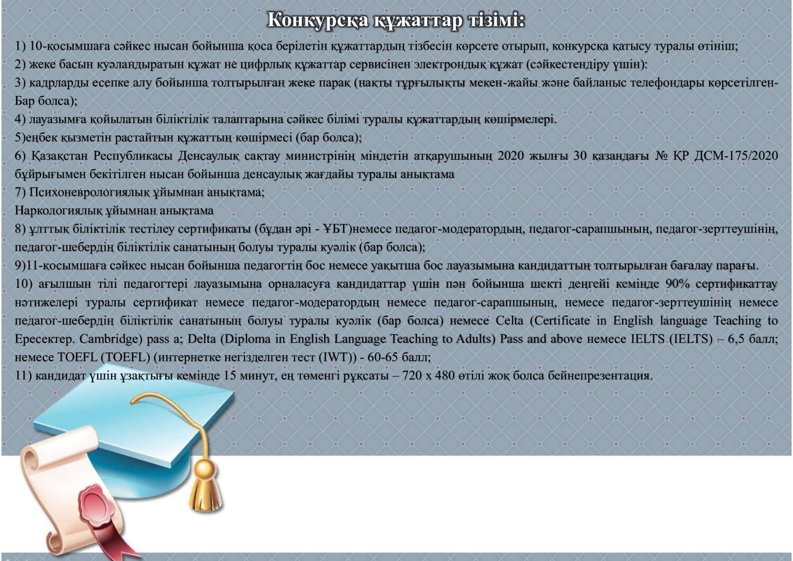 10) ағылшын тілі педагогтері лауазымына орналасуға кандидаттар үшін пән бойынша шекті деңгейі кемінде 90% сертификаттау нәтижелері туралы сертификат немесе педагог-модератордың немесе педагог-сарапшының, немесе педагог-зерттеушінің немесе педагог-шебердің біліктілік санатының болуы туралы куәлік (бар болса) немесе Celta (Certificate in English language Teaching to Ересектер. Cambridge) pass a; Delta (Diploma in English Language Teaching to Adults) Pass and above немесе IELTS (IELTS) – 6,5 балл; немесе TOEFL (TOEFL) (интернетке негізделген тест (IWT)) - 60-65 балл;