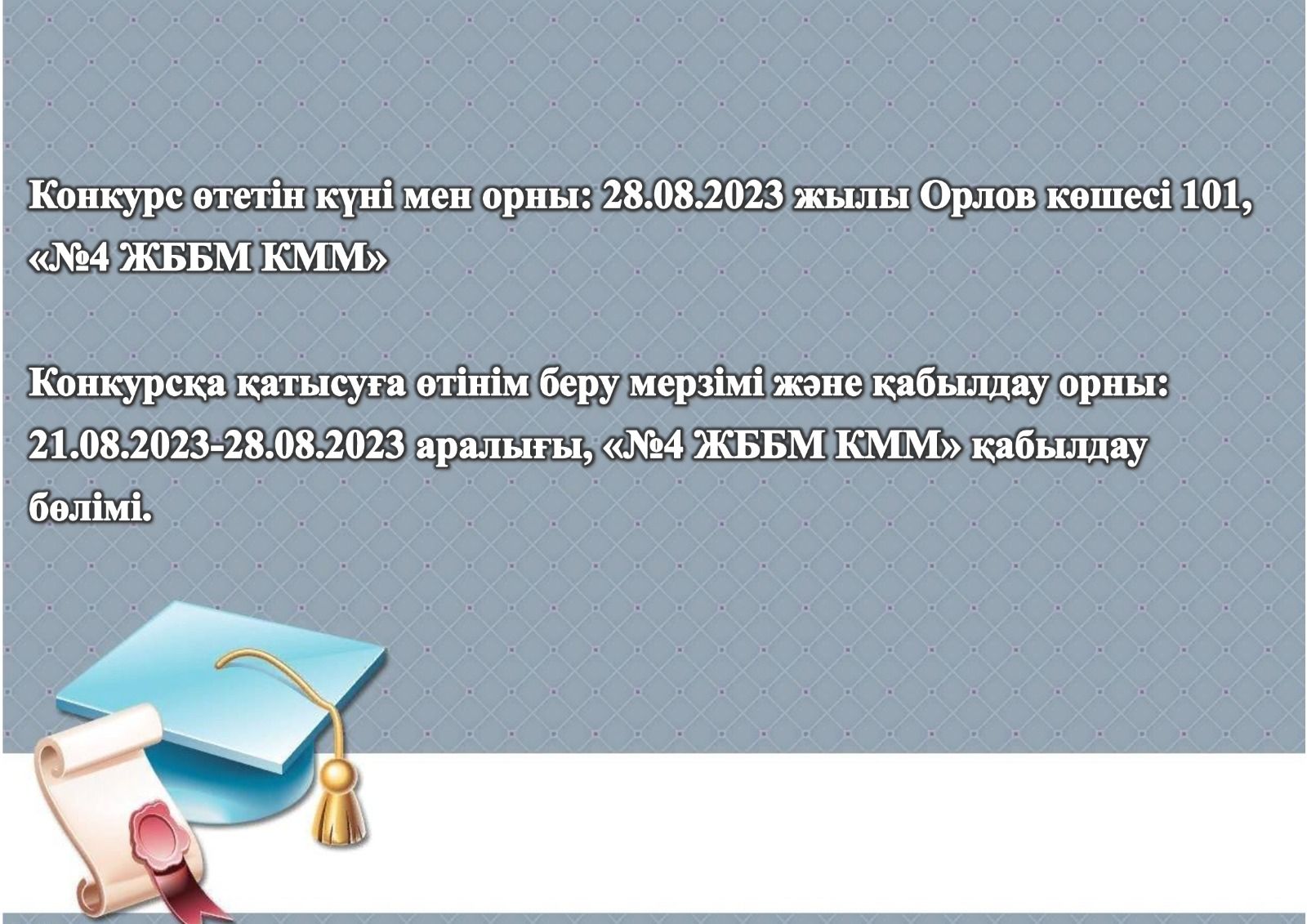 Конкурсқа құжаттарды тапсыру мерзімі: 21.08.2023-28.08.2023. «№4 ЖББМ КММ» қабылдау бөлімі.