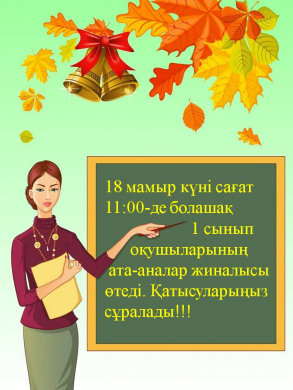 18 мамыр күні сағат 11:00-де болашақ 1 сынып оқушыларының ата-аналар жиналысы өтеді. Қатысуларыңыз сұралады!!!