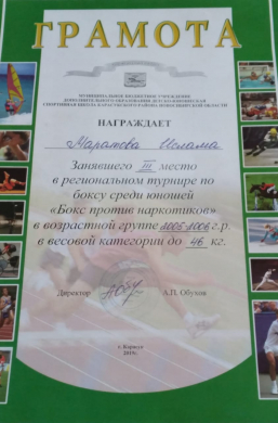Новосибир облысы, Карасук ауданында өткен 2005-2006 жылы туған кіші жасөспірімдер арасындағы бокстан өткен «Бокс есірткіге қарсы» аймақтық турнирде 46 келі салмақта 8 «Ә» сынып оқушысы МАРАТОВ ИСЛАМ үшінші орынға ие болды. ҚҰТТЫҚТАЙМЫЗ!!!