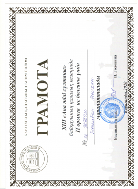Қазақ поэзиясының алыбы Қасым Аманжоловтың туғанына 110 жыл толуына орай орыс мектептерінде білім алатын жас ұрпақ арасында ұлттық тіліміз бен ұлылардың шығармашылықтарын насихаттау мақсатында қазанның 28-і жұлдызында XIII«Ана тілі сұлтаны» байқауының қалалық кезеңі өтті. Бұл байқауға қалалық гимназия, лицей, мекттептер оқушылары белсене қатысты. Біздің мектептен 11 А» сынып оқушысы Дюсембин Асылхан қатысып, екінші орынға иеленді. Құттықтаймыз! Жетекшісі қазақ тілі мен әдебиеті пәні мұғалімі Тоқсамбаева А.А.