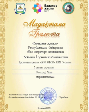 "Бауыржан оқулары" Республикалық байқауында 5 сынып оқушысы Рыскелді Айша 1 орынға ие болды. Жетекші: Сейлбек Г.Қ