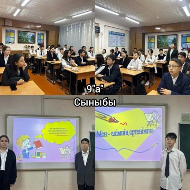 9 “а” сыныбында “ХХІ ғасыр-сауатты ұрпақ ғасыры” апталығы жоспарына сай “Мен -елімнің ертеңімін” тақырыбында сынып сағаты өтті. Сынып жетекшісі Сагындыкова С.С