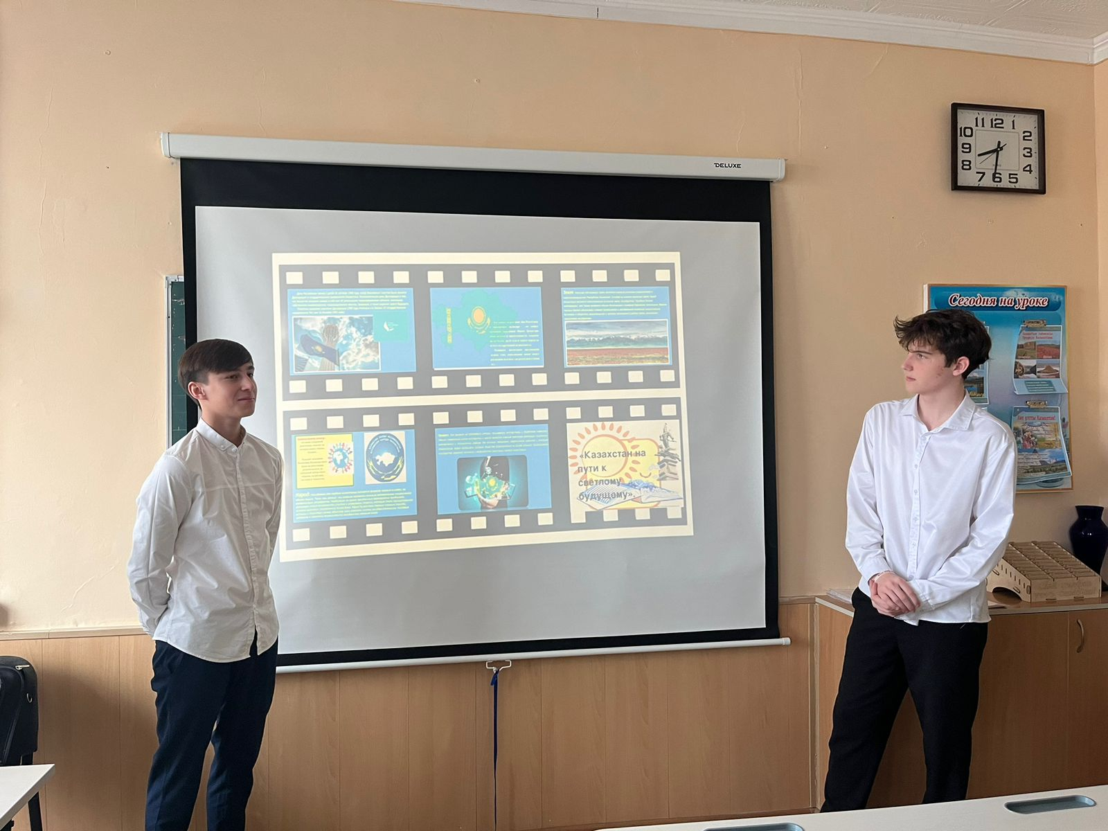 Бүгін 11 «Б» сыныбында «Республикам – мақтанышым!» тақырыбында сынып сағаты өтті. Сынып сағаты аясында балалар Қазақстан Республикасының Тәуелсіздік жолын бейнелейтін фильммен танысып, Республикамыздың жеткен жетістіктерін атап өтіп, Қазақстанның жарқын болашаққа дұрыс жолда келе жатқанына сенім білдірді.