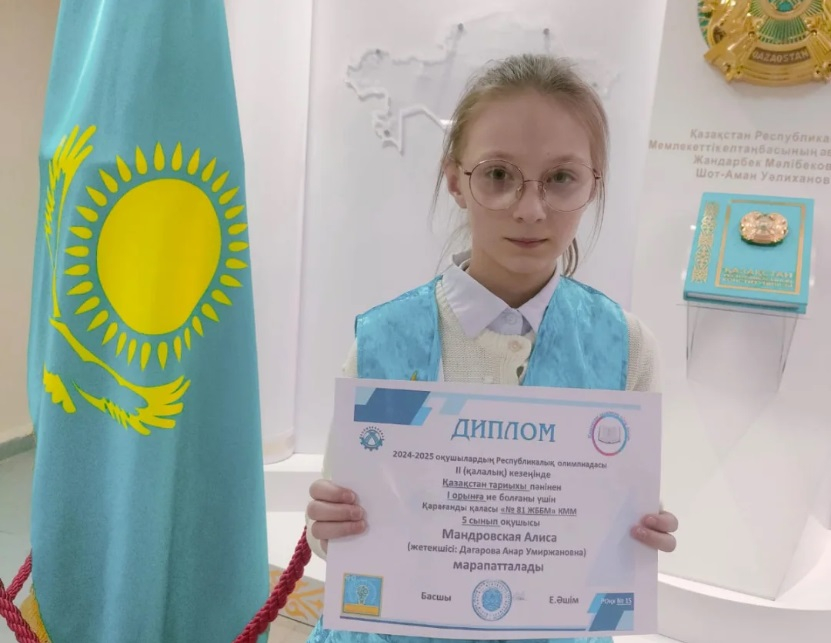 5 «А» сынып оқушысы Алиса Мандровскаяны Қазақстан тарихы пәнінен Республикалық олимпиаданың қалалық кезеңінде 1 орынға ие болғаны үшін құттықтаймыз. Тарих пәнінің мұғалімі: Дагарова А.У.