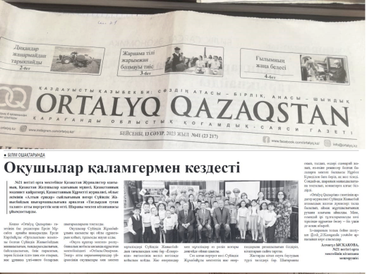 13.04.23г. в номере Областной газеты «Орталық Қазақстан» была опубликована статья о прошедшем в нашей школе вечере-портрета «Тағдырдан туған талант», посвященном творчеству члена Союза журналистов Казахстана, Союза писателей Казахстана, деятеля культуры Казахстана, почетного журналиста Казахстана, лауреата премии акима области «Алтын Сункар» Суюндика Жанысбая.