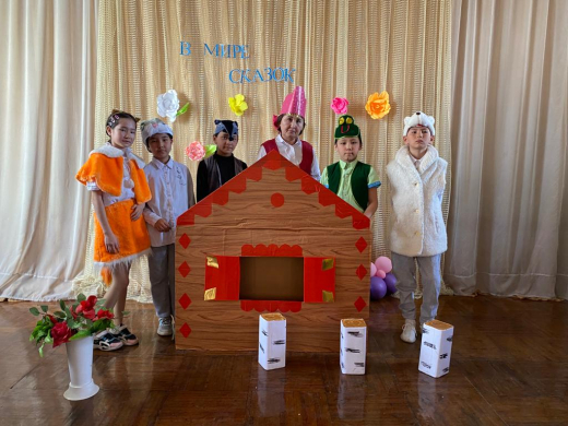 24-28 сәуір аралығында «Тіл мен тарих- ғасырлар куәсі» тақырыбында өтетін гуманитарлық пәндер бірлестігі апталығында 5А сынып оқушыларымен «Ертегілер әлемінде» атты орыс халқының «Үйшік ертегісін»саханалап өз өнерлерін көрсетті, Мақсаты: - ертегілер арқылы балаларды адамгершілікке, мейірімділікке және адалдыққа, еңбексүйгіштікке тәрбиелеу; - қиялдау, мәнерлеп сөйлеуге баулу, шығармашылық қабілетін дамыту.