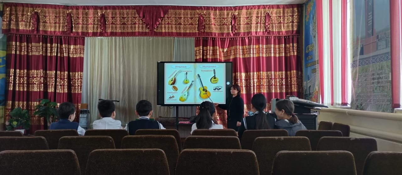 28.02.2025 ж музыка мұғалімі «Еуропа халықтарының музыкалық дәстүрі» тақырыбында ашық сабақ өткізді. Онда оқушылар итальян және испан халықтарының музыкалық аспаптармен, билермен және әндермен танысты. Сонымен қатар оқушылар шығармашылық іс-шараларға белсенді қатысты, сұрақтарға жауап берді.