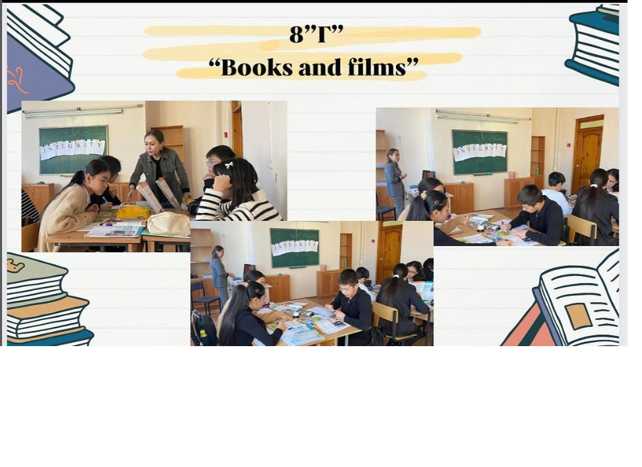 2023-2024 оқу жылының ІІІ тоқсанындағы жас мамандармен жұмыс жоспарының негізінде ағылшын тілі пәні мұғалімі Кылышова А.Б. 8“Г” сыныбында ағылшын тілінен “Books and films” тақырыбында ашық сабақ өткізді. Ашық сабақтың мақсаты: кітап пен фильмге қатысты жаңа сөздерді үйрену және сол сөздерді қолдана отырып фильм және кітап туралы ойларын айта алу.