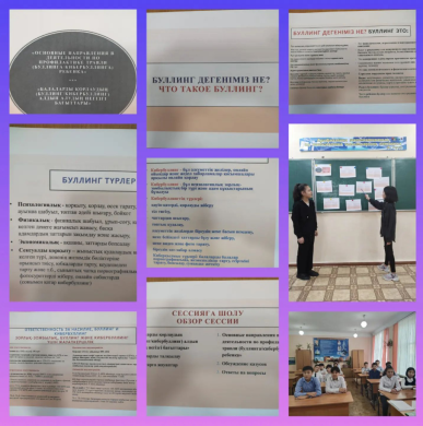 8 "а" сынып оқушыларына "Балаларды қорлаудың (буллинг/кибербуллинг) алдын алудың негізгі бағыттары" туралы оқиғаларды талқылау. Осы бағыт бойынша таныстырып өтілді. Мақсаты: буллинг түрлерімен таныстыру, буллинг үшін жауапкершілік және кибербуллинг түрлер