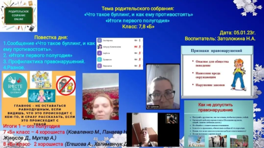 05.01.23г. в 7,8 "Б" классах было проведено родительское собрание (на платформе ZOOM). Тема: "Роль семьи в профилактике правонарушений". "Что такое буллинг, и как ему противостоять"," "Итоги первого полугодия". Воспитатель: Затолокина Н. А..