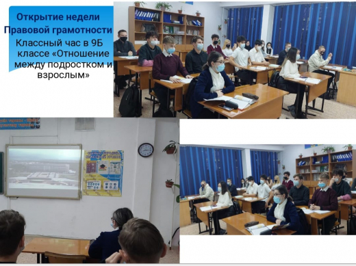 2022 жылдың 7 ақпанында «Құқықтық навигатор» құқықтық сауаттылық апталығы аясында 9Б сыныбында «Жасөспірім мен ересек арасындағы қарым-қатынас» тақырыбында сынып сағаты өткізілді.