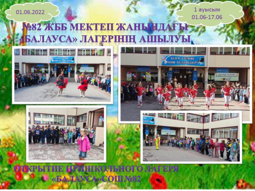 2022 жылдың 1 маусымында № 82 мектеп жанындағы «Балауса» жазғы сауықтыру лагерінің ашылу мерекесі өтті.Балаларды қорғау күнімен тұспа-тұс келген лагердің салтанатты ашылу мерекесінде «Звездопад» би тобы би билеп, музыка мектеп оқушылары ән айтты.Одан әрі балалармен «Көңілді жарыс» мәресі өтті. Лагердің ашылу мерекесіне келген оқушылар жақсы көңілді күймен қайтты.