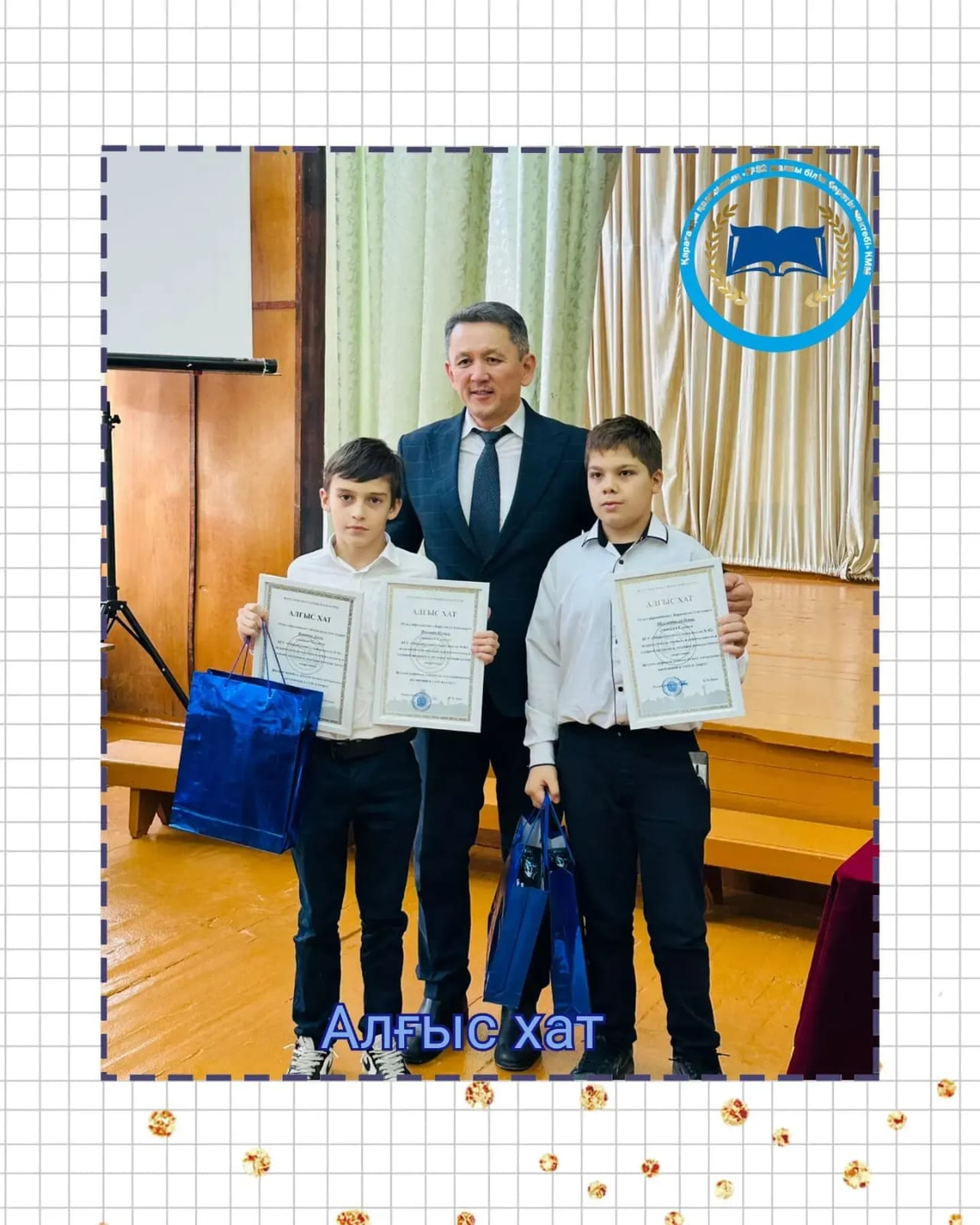 29.11.2023 күні Қарағанды қаласының білім бөлімінің басшысы Әшім Есентай Мұқатайұлы мектебімізге арнайы келіп, ерлік көрсеткен оқушылармен және олардың ата-аналарымен кездесті. Ағайынды Фомаиде мен Шолленбергер Ильяны білім бөлімінің Алғыс хатымен марапаттап, сыйлық табыстады. Сол күнді еске түсірсе кетсек, 18 қараша күні қатты дауыл салдарынан мектеп артындағы спорттық кортта ойнап жүрген оқушы, қатты желдің әсерінен қауіпті жағдайда қалады. Арес, Яннис, Илья ерлік көрсетіп, газон астында қалған баланы құтқарып қалады.