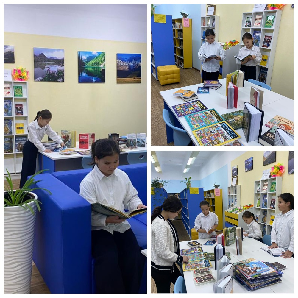 №82 ЖББМ кітапханасында үзіліс уақытында "Оқуға құштар мектеп" жобасы аясында оқушылар жаңа түскен көркем әдебиетпен танысып, кітап оқуда.