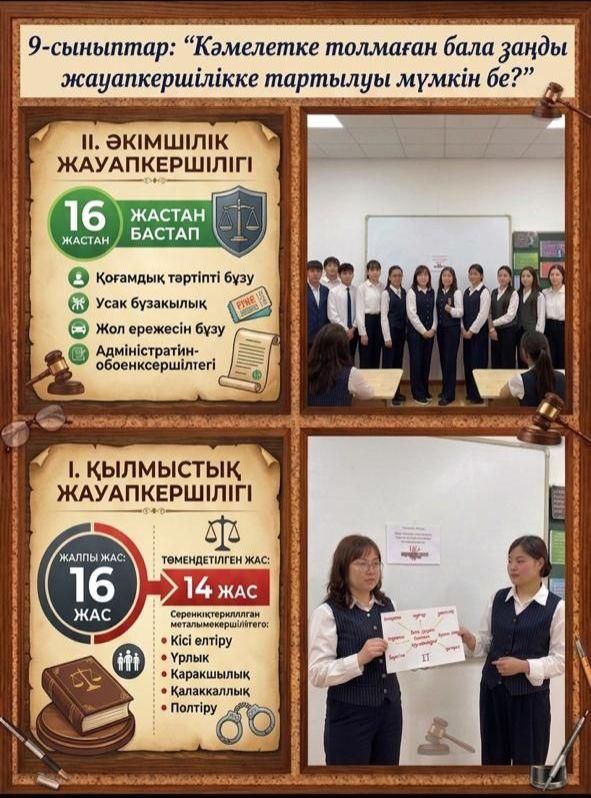 20.04.26 ж. 9 «А» сынып оқушыларымен «Кәмелетке толмаған бала заңды жауапкершілікке тартылуы мүмкін бе?» тақырыбында сынып сағаты өткізілді.
