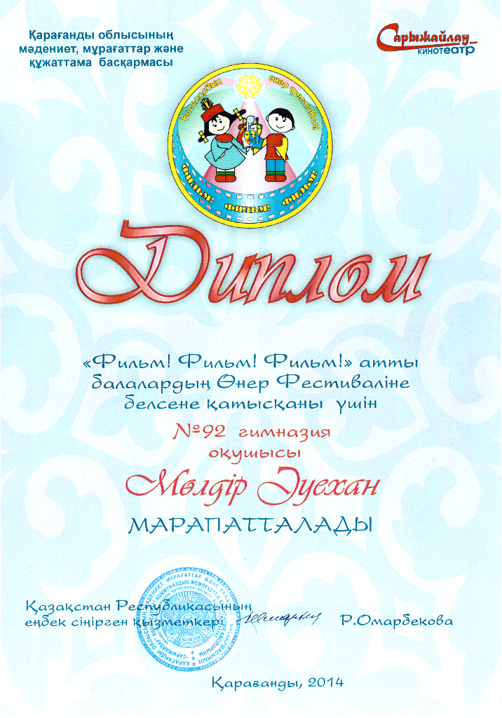 «Сарыжайлау» кинотеатрында 2014 жылдың 22 қарашада өткен облыстық «Фильм!Фильм!Фильм!» фестиваліне гимназия оқушысы Әуелхан Мөлдір қатысып, ән айту шеберлігін танытып, көркемөнерпаз жетекшісі Б.Е.Тыхметовпен бірге марапатқа ие болды. Құттықтаймыз!