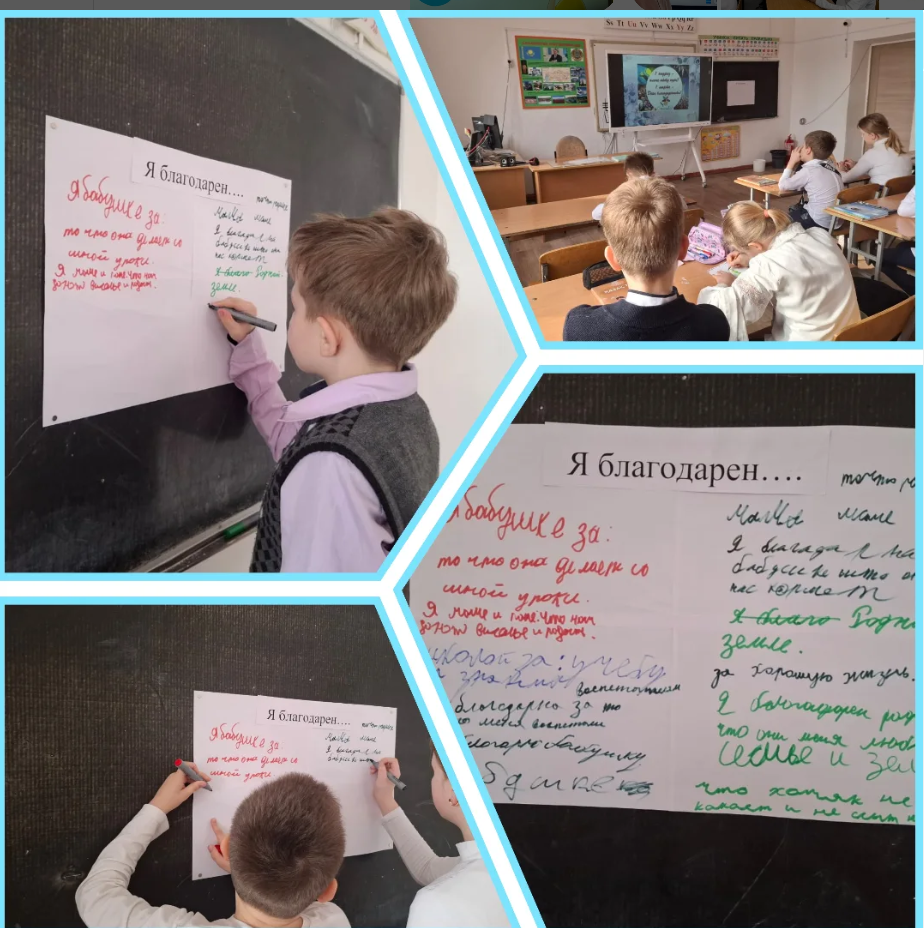 4 "Б" сыныбында Алғыс айту күніне арналған " Мен ризамын..." тақырыбында сынып сағаты өтті.
