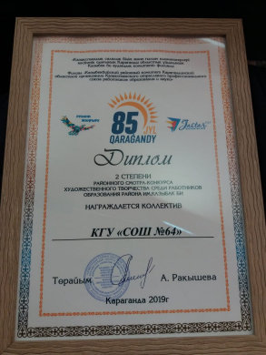 Поздравляем Коллектив ОСШ № 64 за занятое 2 место Районного Смотра-Конкурса художественного творчества среди работников образования раойна им. Казыбек Би.