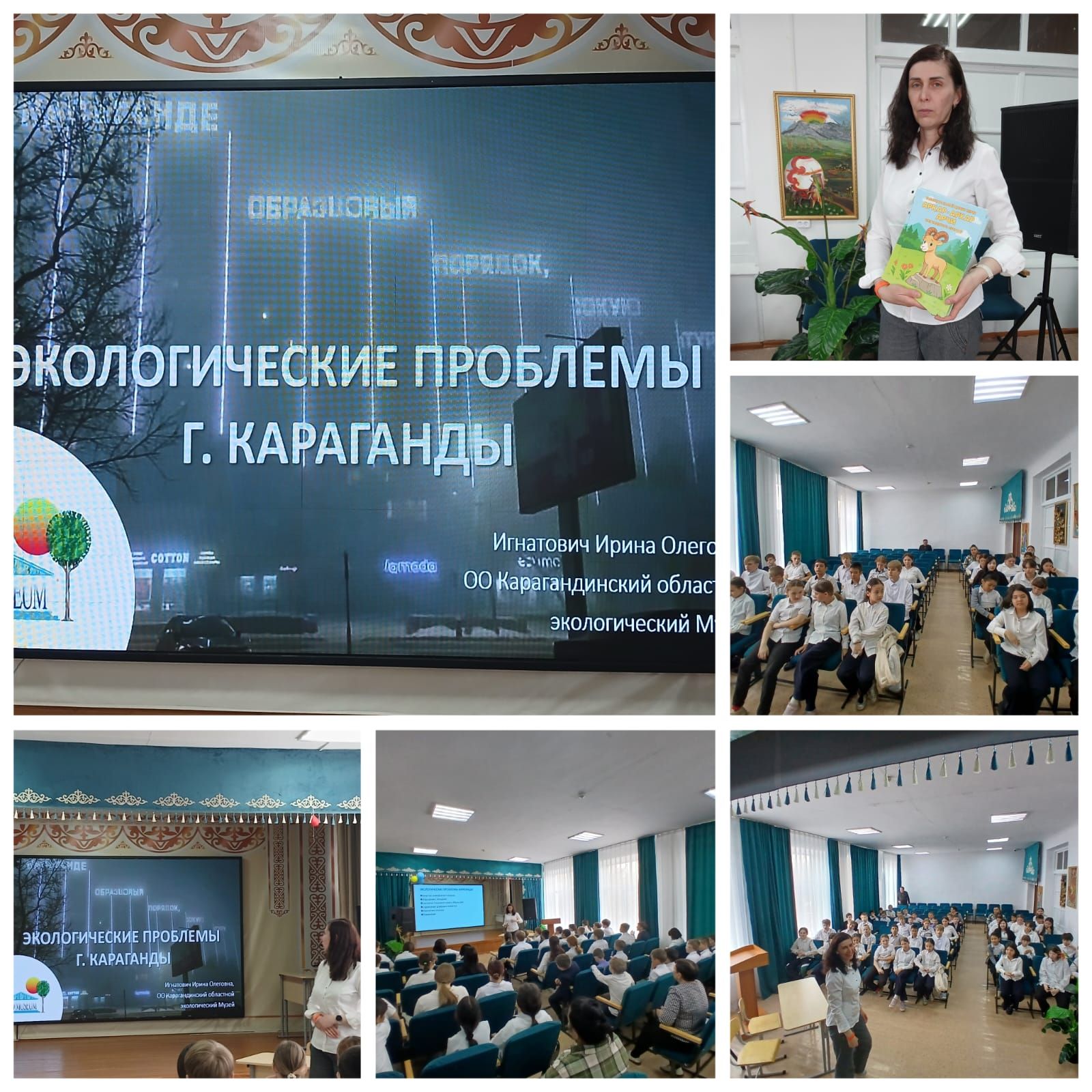 Ирина Олеговна рассказала об экологических проблемах Караганды и Карагандинской области, ведь наша область - крупный промышленный центр Казахстана. Серьезной проблемой остается охрана атмосферного воздуха. За последние годы он стал несколько чище. Выбросы в атмосферу все еще остаются высокими и составляют 660 тысяч тонн в год или в среднем 550 кг на одного жителя области. Сброс недостаточно очищенных стоков промышленных предприятий области в реку Нуру привел к накоплению загрязняющих веществ в донных отложениях, наиболее токсичными из которых является ртуть. Ребята задавали интересующие вопросы об экологии нашего региона, была интересная беседа