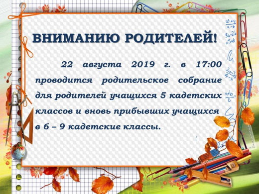 22 августа 2019 г. в 17:00 проводится родительское собрание для родителей учащихся 5 кадетских классов и вновь прибывших учащихся в 6-9 кадетские классы.