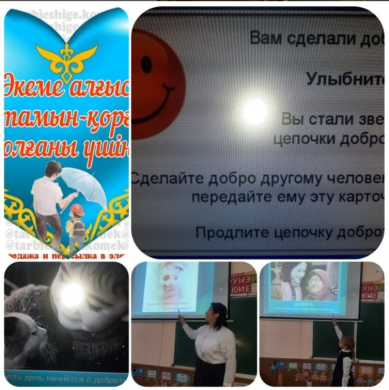 1 В сыныбында "Мейірімділік пен мейірімділік туралы сөйлесейік" атты сынып сағаты өтті Мақсаты: оқушыларға қоғамдағы мінез-құлық ережелерін, қоғамдағы мінез-құлықтың этикалық нормаларын бір-бірімен қарым-қатынас жасауды үйрету. Сынып жетекшісі Тургамбаева