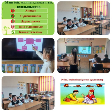 03.04.2023ж күні 2"А" сыныбында сынып сағатты өтті.Тақырыбы: "Ұлттық құндылықтарды насихаттау". Мақсаты:Оқушыларға ұлттық құндылықтарды құрметтеуге тәрбиелеу ,ұлттық құндылықтар- біздің тіршілігіміз бабаларымыздан қалған асыл мұра екенін түсіндіру.