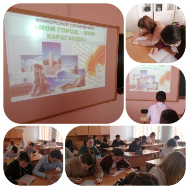 В рамках недели, посвященной Дню города Караганды, среди учащихся 8 - 9 классов прошёл конкурс сочинений на тему "Мой город - моя Караганда". Цель мероприятия : воспитание духовно - нравственных качеств учащихся, патриотизма и любви к своему городу, к своей малой Родине.