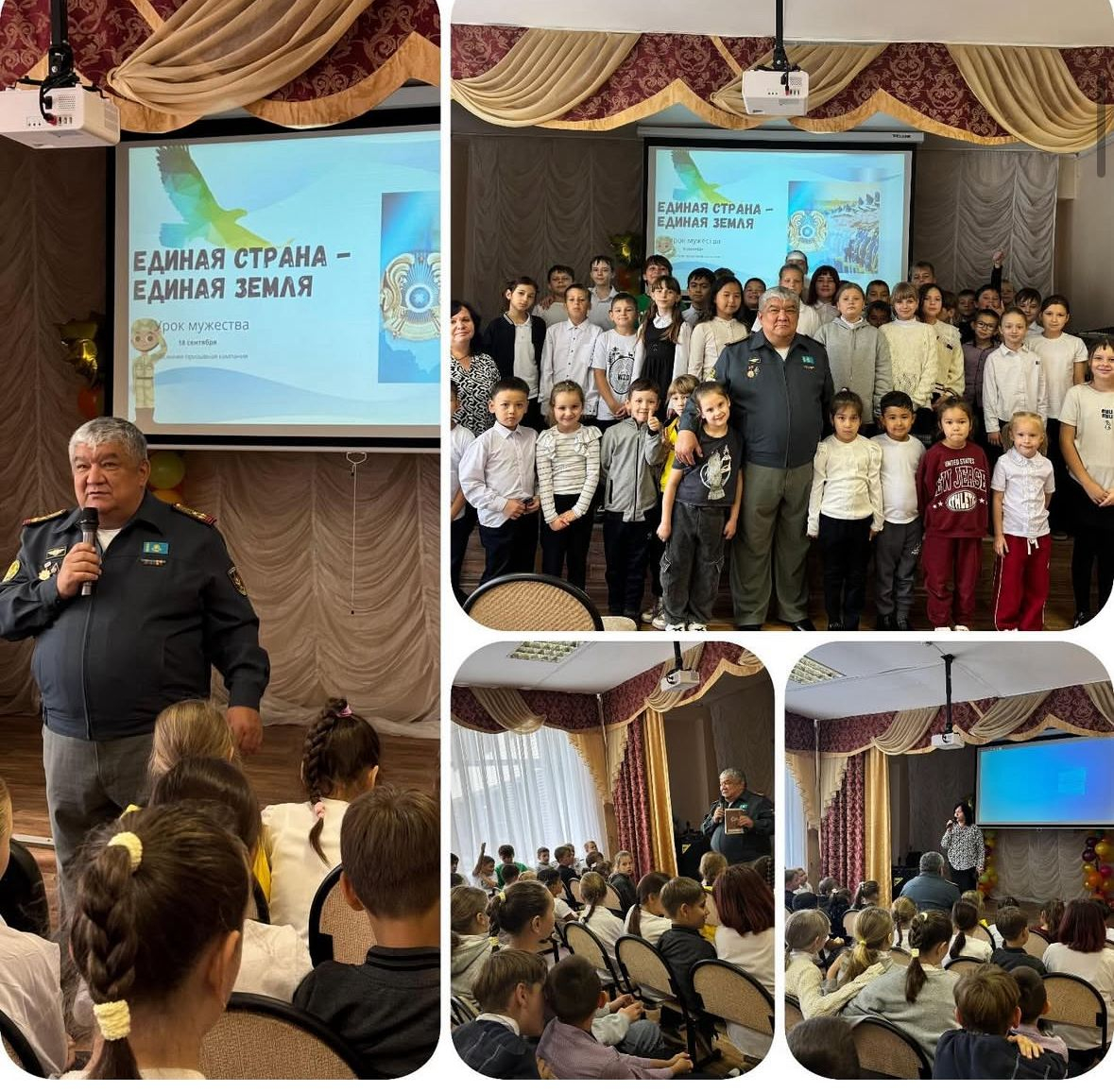 18 қыркүйекте біздің мектепте "Бір ел – бір жер" сабағы өтті. 1 және 5 сынып оқушылары Қазақстан Республикасы Қарулы Күштері запасының полковнигі Руслан Слямжанович Шаянбаевпен кездесті. Қонақ балаларға қызмет, батылдық пен достық, Отанды сүю мен қорғаудың маңыздылығы туралы айтып берді.