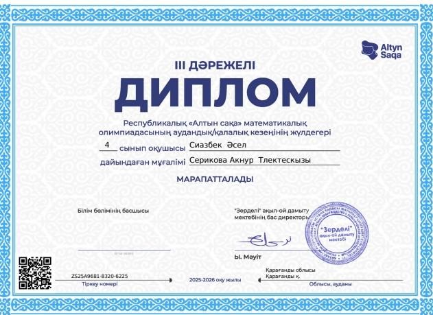 "Алтын сақа" математикалық олимпиаданың қалалық кезеңінде 3 орын алған 4"А" сынып оқушысы Сиазбек Әсел марапатталды.