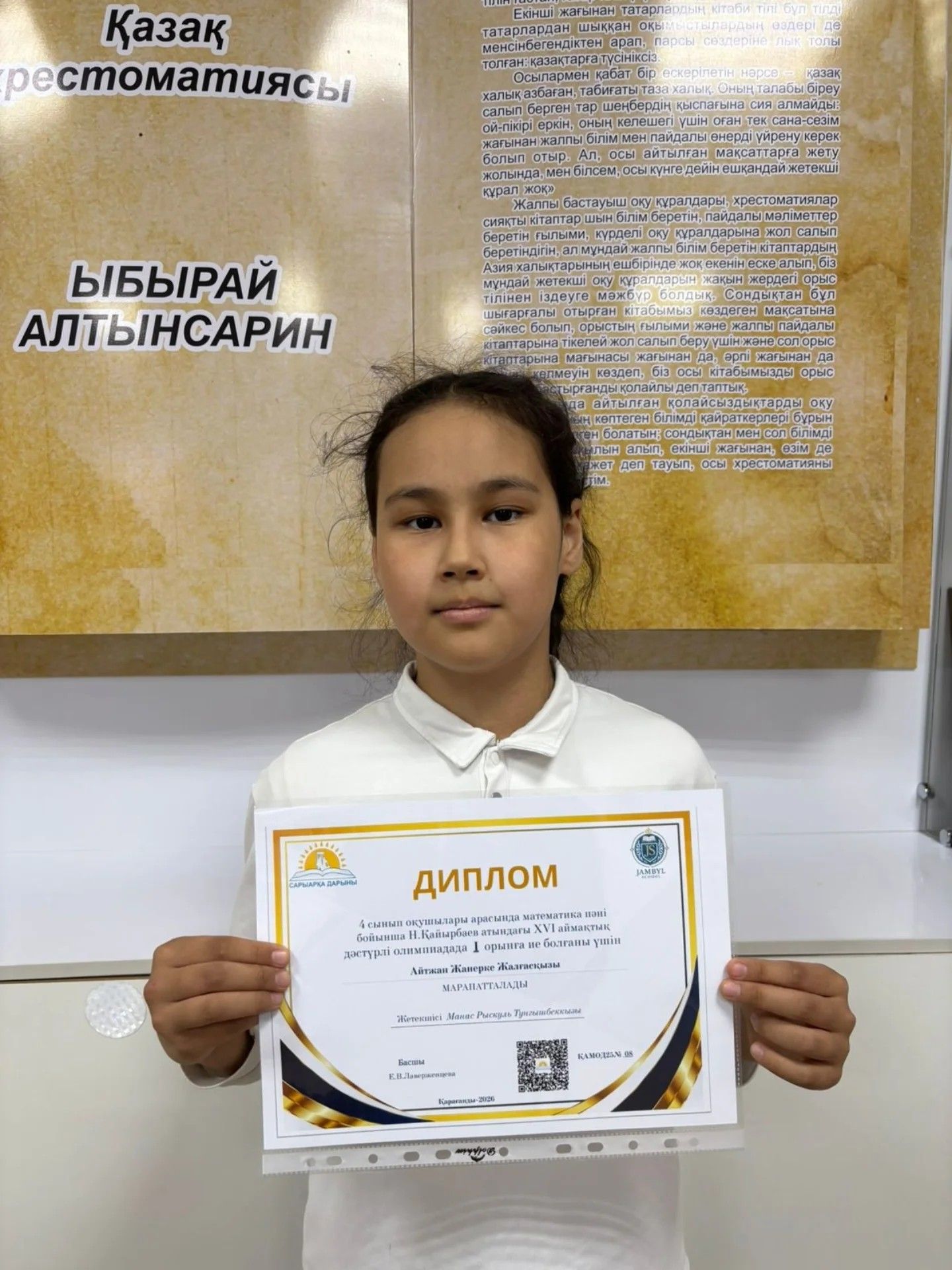 4 сынып оқушылары арасында математика пәні бойынша Н.Қайырбаев атындағы XVI аймақтық дәстүрлі олимпиадада 4 “Ә” сынып оқушысы Айтжан Жанерке Жалғасқызы І орынды иеленіп Дипломмен марапатталды.