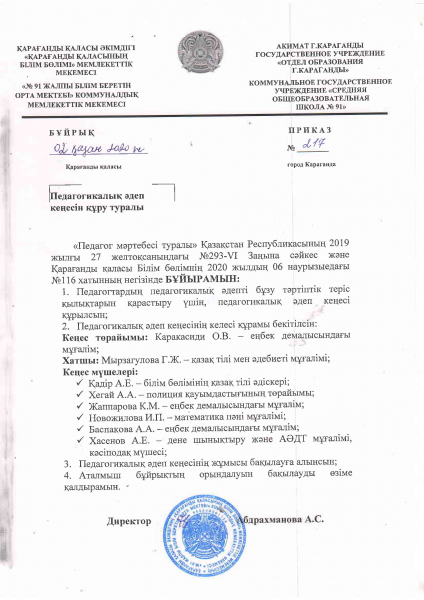 В соответствии с подпунктом 34-1) статьи 5Закона Республики Казахстан от 27 июля 2007 года «Об образовании», пунктом 3 статьи 5и пункта 1 статьи 16Закона Республики Казахстан от 27 декабря 2019 года «О статусе педагога» утверждены: 1) Правилапедагогической этики согласно приложению 1 к приказу; 2) Типовые правилаорганизации работы совета по педагогической этике согласно приложению 2 к приказу. Основными принципами педагогической этики являются: 1) добросовестность: добросовестность педагога предполагает его ответственность за результат обучения и воспитания, умение осуществлять коррективы в своей деятельности, развитую способность к критике и рефлексии, открытость для любых мнений, обучающихся и воспитанников, их родителей (законных представителей), коллег; 2) честность: честность педагога предполагает открытость его оценочной деятельности, прозрачность создаваемой им образовательной среды. Честность запрещает педагогу нарушать права обучающихся и воспитанников, их родителей (законных представителей), коллег; 3) уважение чести и достоинства личности: Педагог уважает честь и достоинство обучающихся и воспитанников, их родителей (законных представителей), людей, которые становятся объектами его профессионального внимания, тактичен в общении с ними. Он искренне желает развития ребенка, проявляет готовность всегда прийти ему на помощь, обеспечивает деликатность в оценке успехов (неуспехов) обучающегося и воспитанника с целью способствования развитию его личностного роста. Не допускается применение методов физического, морального и психологического насилия по отношению к участникам образовательного процесса; 4) патриотизм: Педагог преданно и с любовью относится к своей Родине - Республике Казахстан, истории, традициям и языку. Сохраняет культурные и исторические традиции Республики Казахстан, передает это отношение обучающимся и воспитанникам. 5) уважение общечеловеческих ценностей и толерантность: Признавая приоритет общечеловеческих ценностей, педагог с уважением относится к особенностям, ценностям и достоинству каждой национальной культуры. Педагог воспитывает культуру межнациональных отношений, пробуждает у обучающихся уважение прав и достоинства всех наций и всех людей вне зависимости от возраста, пола, языка, национальности, вероисповедания, гражданства, происхождения, социального, должностного и имущественного положения или любых иных обстоятельств; Толерантность педагога предполагает терпимость к обучающимся и воспитанникам, их родителям (законным представителям), терпимость к их социальному, должностному и имущественному положению, полу, расе, национальности, языку, отношению к религии, культуре, убеждениям, месту рождения и жительства, а также умение понимать и учитывать в работе несовершенства обучающихся и воспитанников. Педагог способствует созданию климата доверия и уважения в школьном коллективе; 6) профессиональная солидарность: Педагог заботится о престиже профессии, уважает честь и достоинство коллег, не допускает действий, наносящих ущерб авторитету учительства. Не допускается в какой бы то ни было форме злоупотреблять доверием своих коллег, мешать им выполнять профессиональные обязанности, наносить им какой-либо ущерб. Педагог оказывает содействие коллегам в повышении уровня теоретич