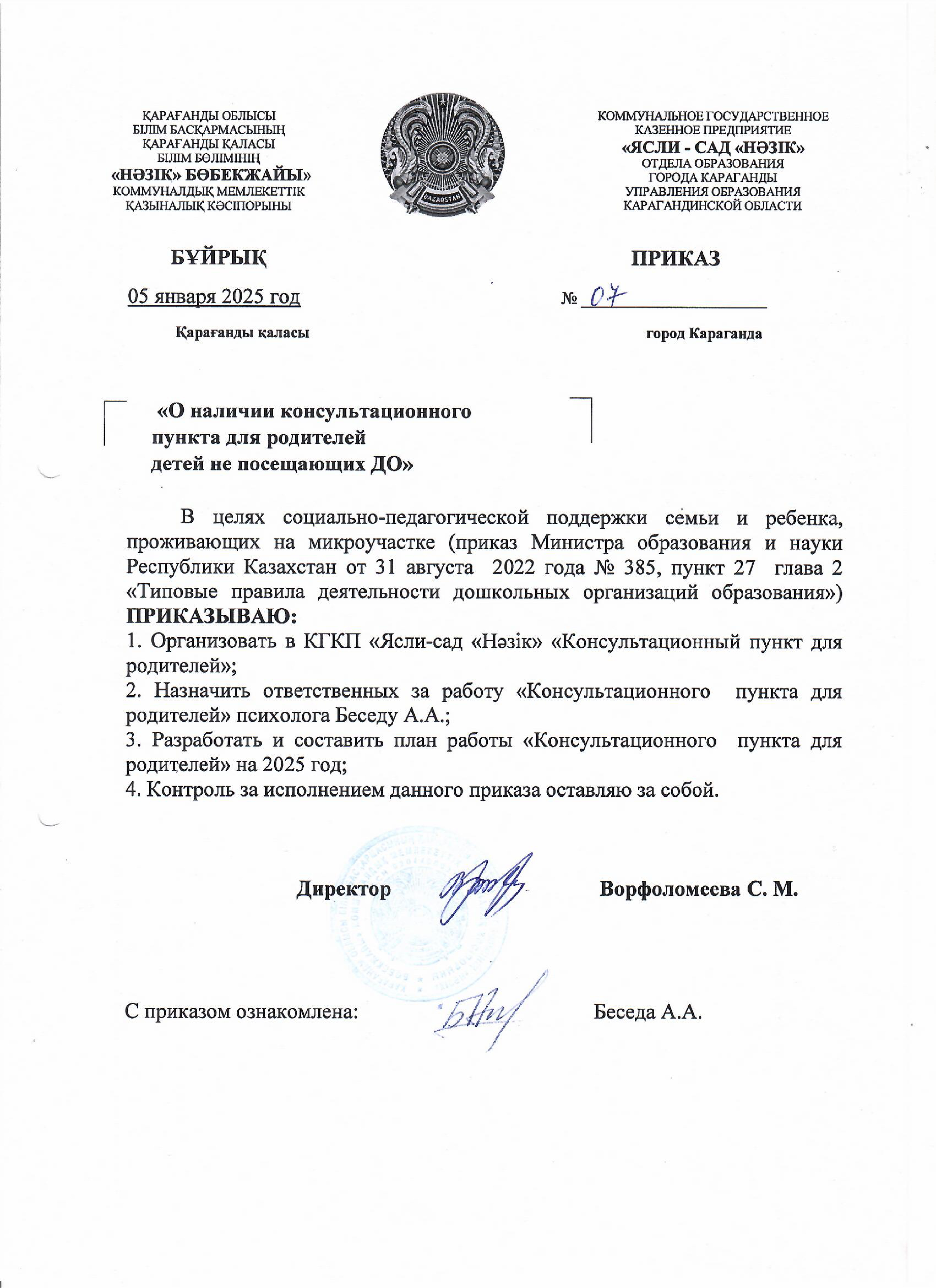 Приказ "О создании антикоррупционной комплаенс службы в КГКП "Ясли-сад "Нәзік"