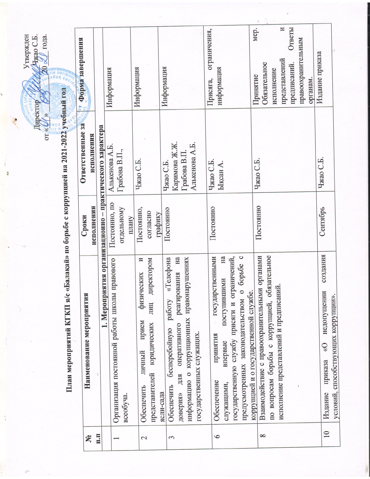 Сыбайлас жемқорлыққа қарсы күрес жөніндегі іс-шаралар жоспары, 2022-2023 оқу жылыСыбайлас жемқорлыққа қарсы күрес жөніндегі іс-шаралар жоспары, 2022-2023 оқу жылы |