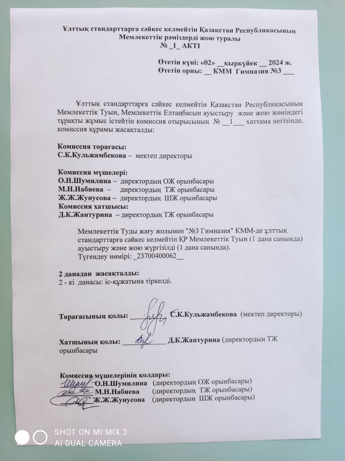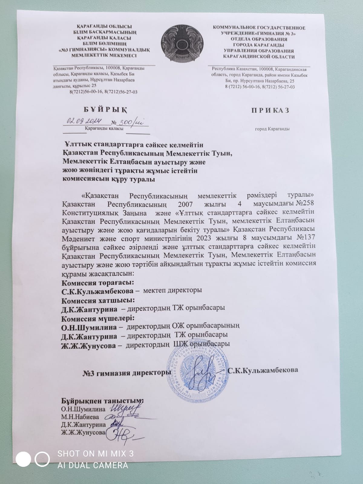КММ "№3 Гимназиясы" директорының бұйрығы, 2024-2025 о.ж.Ұлттық стандартқа сәйкес келмейтін ҚР-ң Мемлекеттік Елтаңбасын, Мемлекеттік Туын ауыстыруға және жоюға арналған комиссия құру туралы |