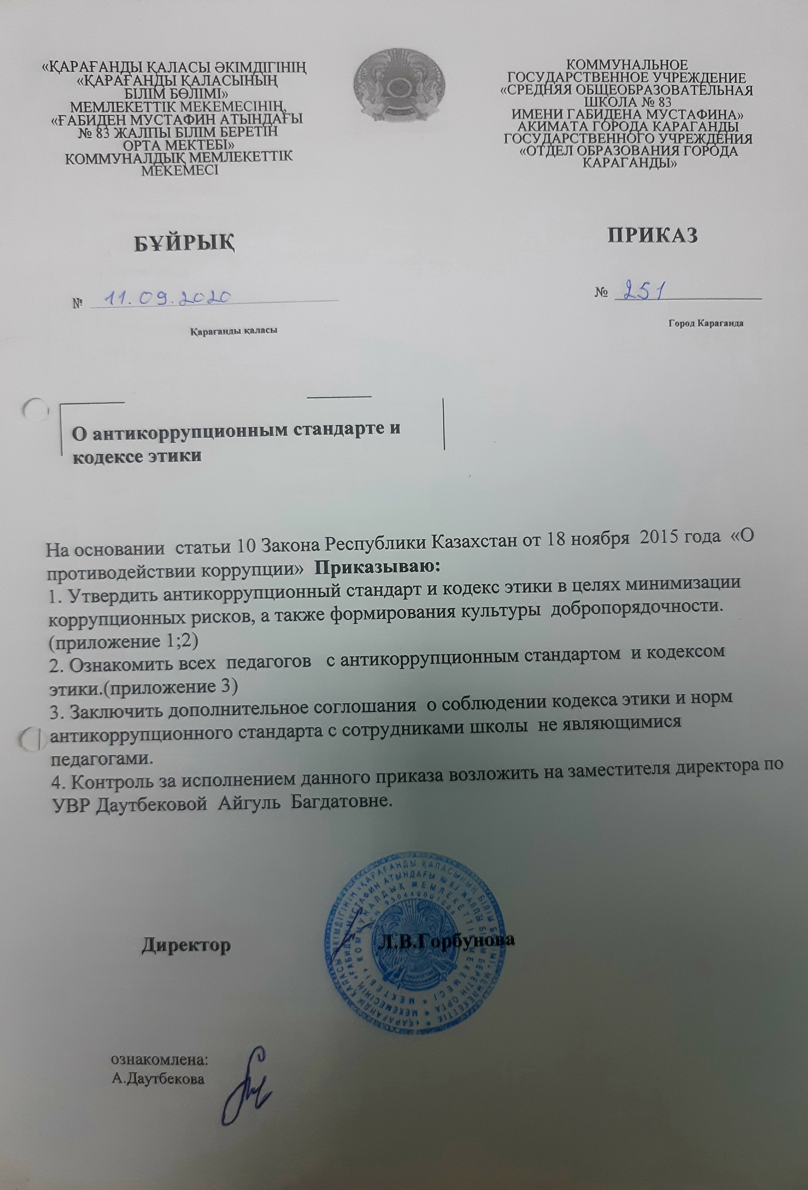 Приказ руководителя об утверждении антикоррупционного стандарта