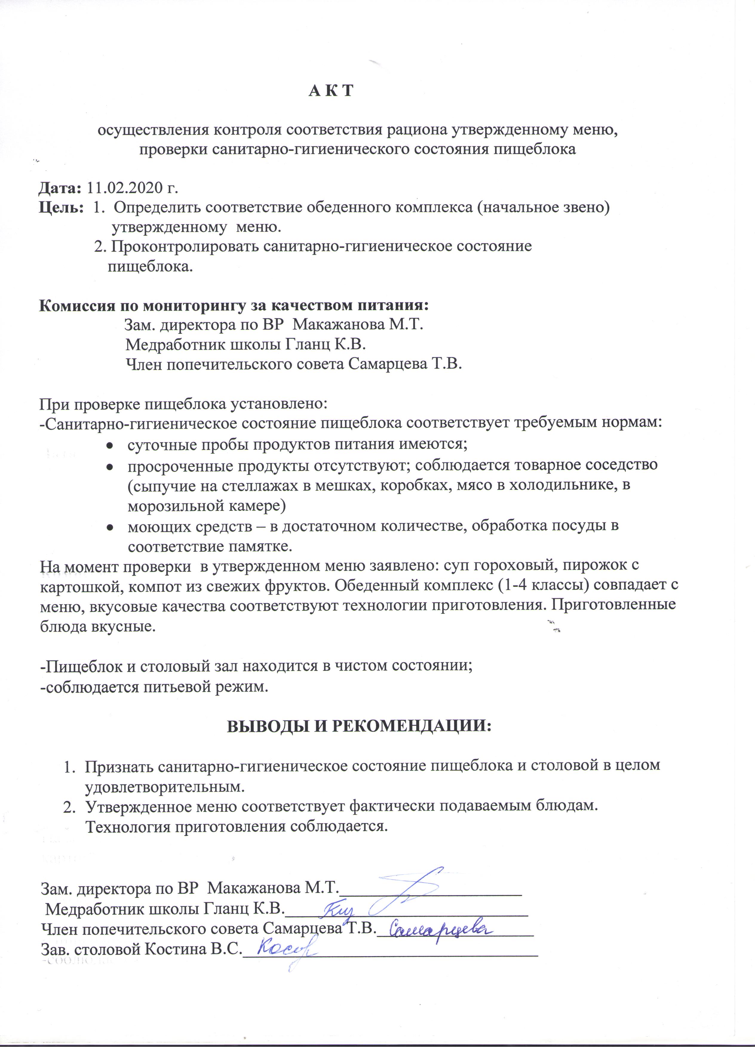 Акт осуществления контроля соответствия рациона утвержденному меню, проверки санитарно-гигиенического состояния пищеблока 11.02.2020Акт осуществления контроля соответствия рациона утвержденному меню, проверки санитарно-гигиенического состояния пищеблока 11.02.2020 |
