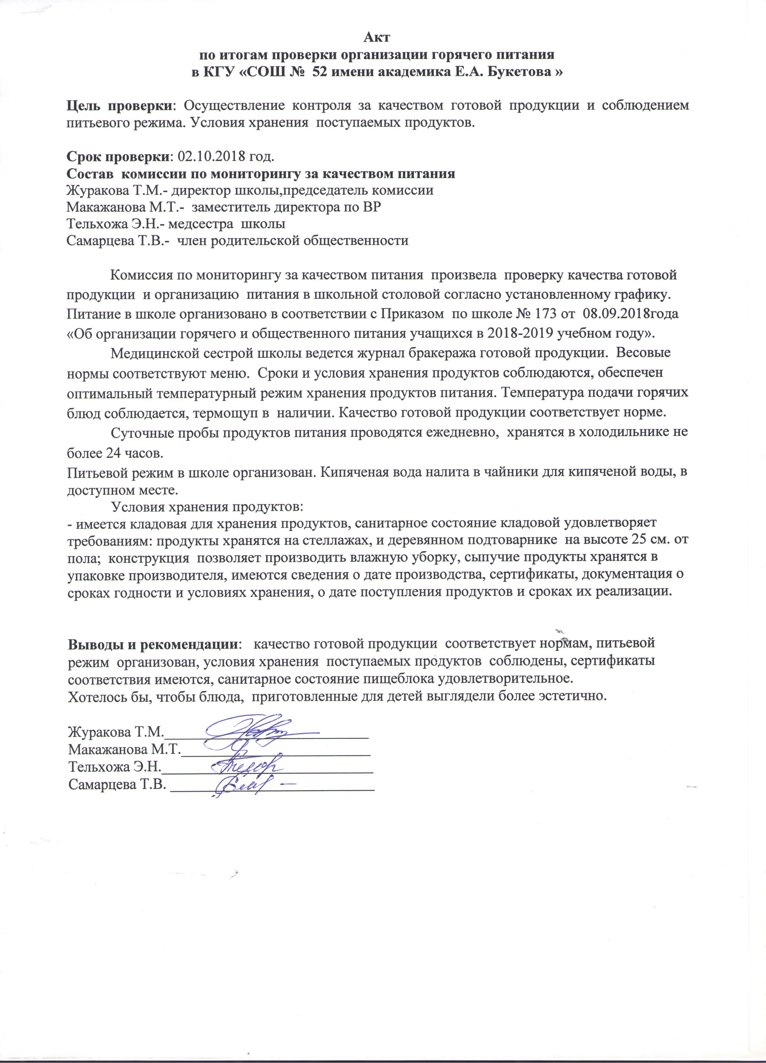 Акт по итогам проверки организации питания 02.10.2018 года
