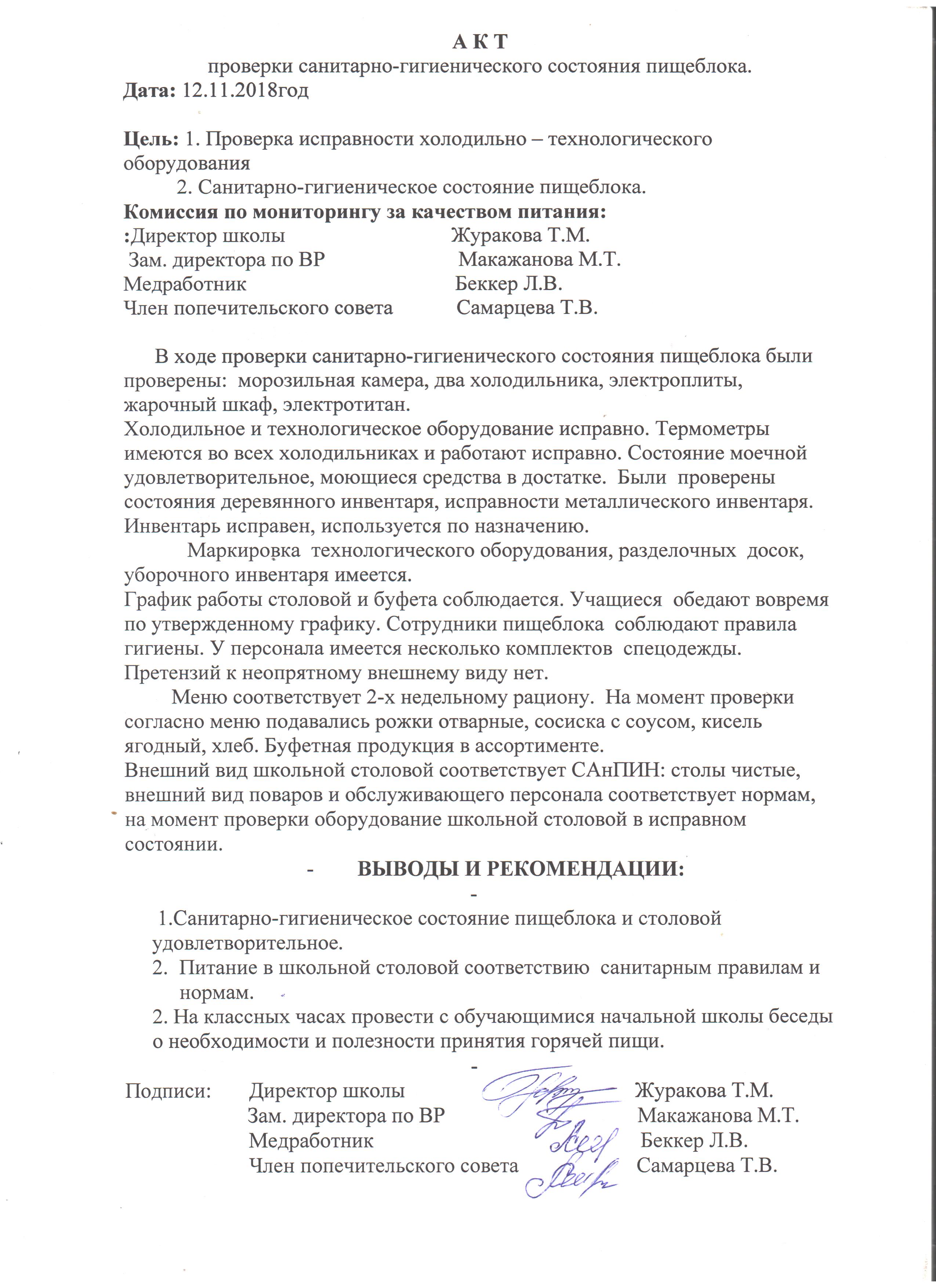 Акт проверки санитарно-гигиенического состояния пищеблока 12.11.2018