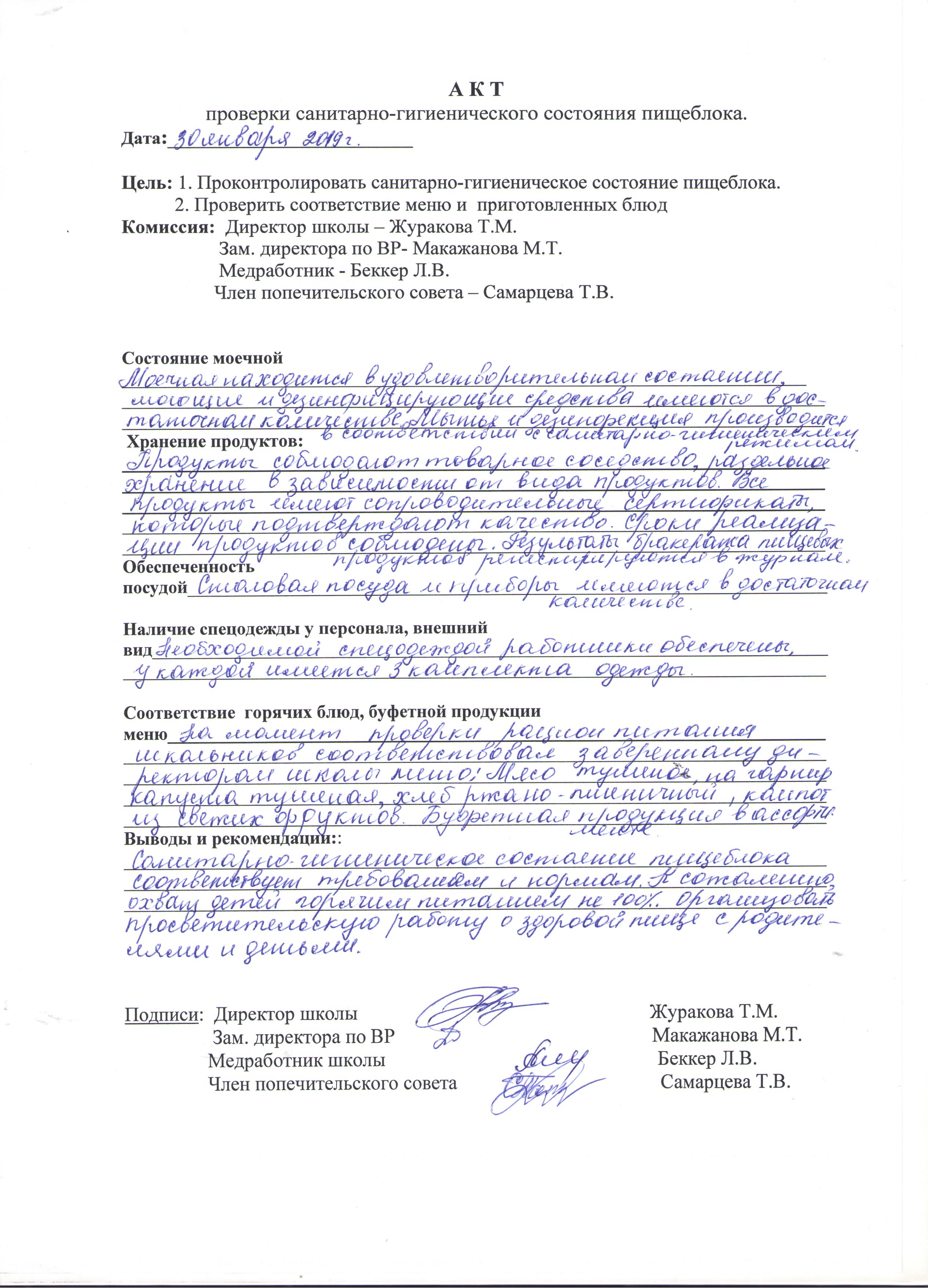 Акт проверки санитарно-гигиенического состояния пищеблока от 30.01.2019