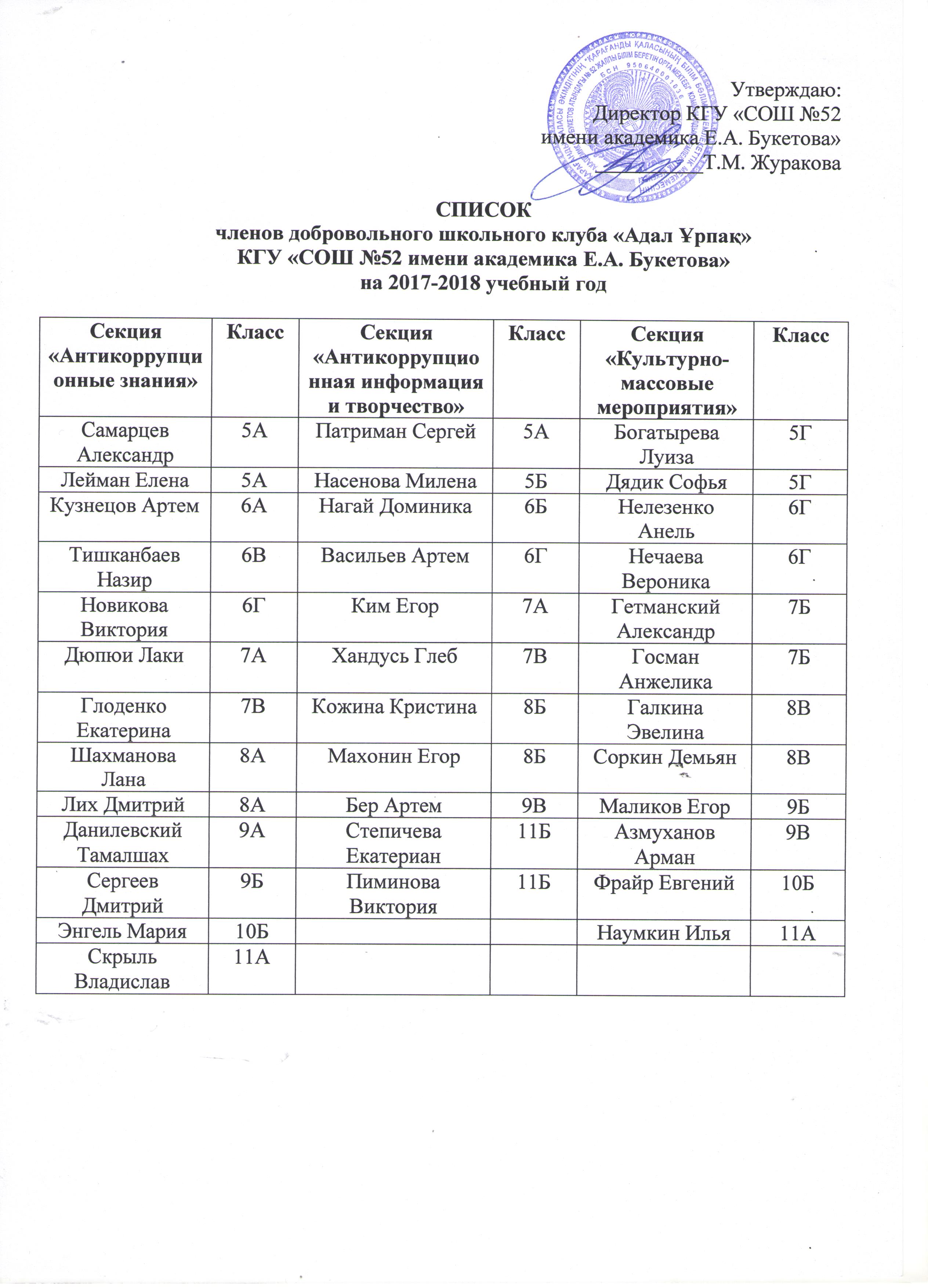 Список членов добровольного школьного клуба "Адал Ұрпақ" на 2017-2018 учебный год05.03.2019 |